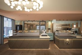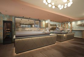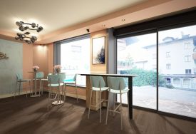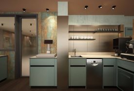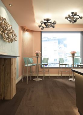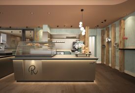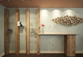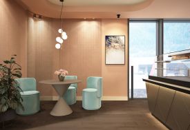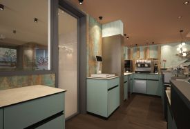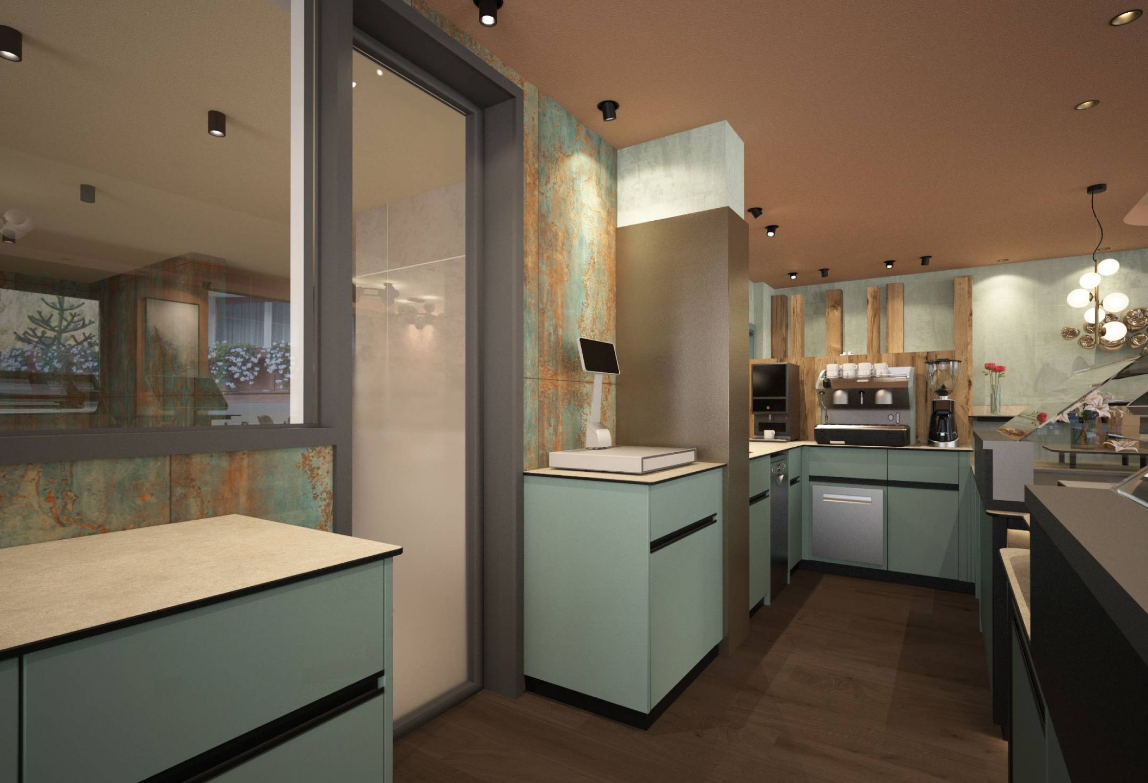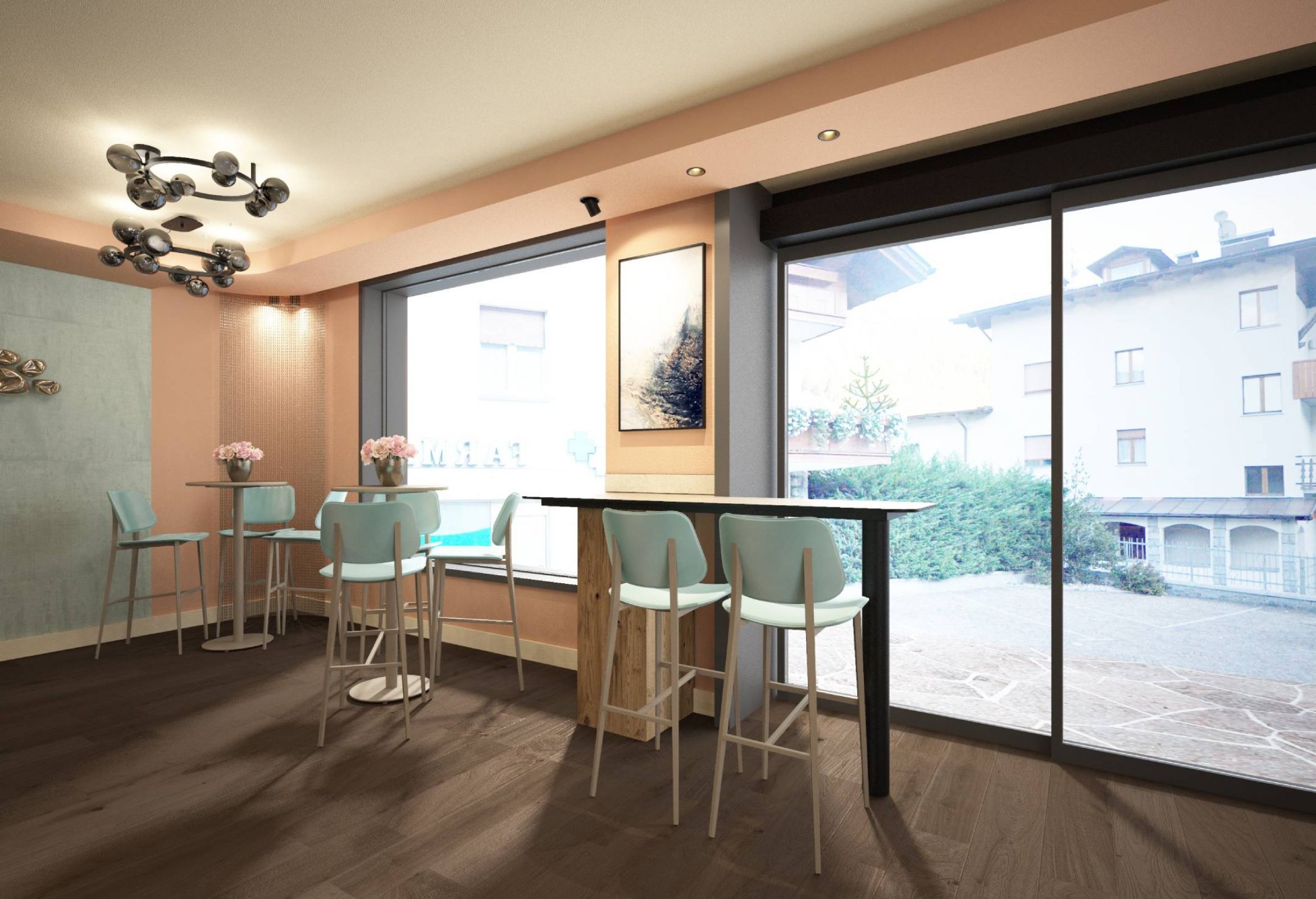 Das Projekt kombiniert Naturholz, Metalleffekte und Pastellakzente in einer ausgewogenen und raffinierten Palette. Die Farbgebung ist das markanteste Element: Rosa-Terrakotta und Puderblau interagieren harmonisch und schaffen eine sanfte und moderne Atmosphäre. Die Tapete mit oxidiertem Finish erinnert an Blautöne und Altholz und wird als vertikales Dekorationselement und Einrichtungselement verwendet. Die Haupttheke mit Metallic-Finish und eingraviertem Logo wird durch LED-Leuchten akzentuiert, die ihre geometrischen Formen und den Kontrast zwischen glatten und strukturierten Oberflächen hervorheben. Das Ergebnis ist ein eleganter und detailverliebter Raum, in dem Materialien und Farben die Persönlichkeit des Besitzers zum Ausdruck bringen.