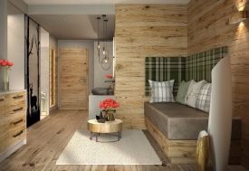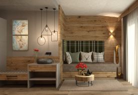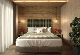 Durante la progettazione abbiamo posto particolare attenzione alla scelta dei dettagli estetici vista la location e l’ambientazione unica: un lago di montagna ai piedi nelle Dolomiti. L’Hotel si trova in una posizione privilegiata di fronte al lago, per questo lo studio cromatico si è rivelato di grande importanza. La scelta dei colori e dei materiali ci ha impegnato in un lungo lavoro creativo. Legno rovere nodi verniciato con vernice a base d’acqua ignifuga, laminato melamminico sulla tonalità del grigio, a riprodurre l’effetto tessuto sia all’interno che all’esterno dei mobili, materiale molto pratico che permette una facile sanificazione. Per le pareti abbiamo scelto una carta da parati dorata ignifuga e idrofuga mentre le stoffe sono in lana con disegno scozzese.